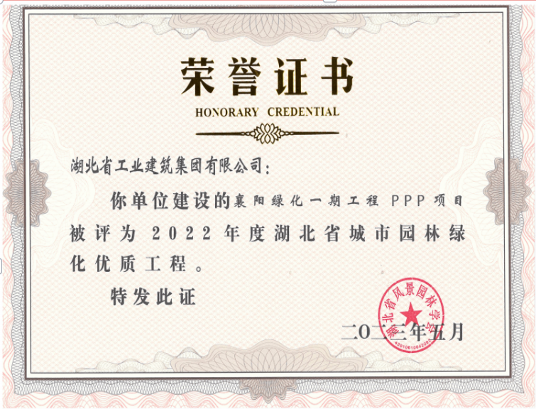 喜報!襄陽綠化一期工程PPP項目被評為“2022年度湖北省城市園林綠化優質工程”